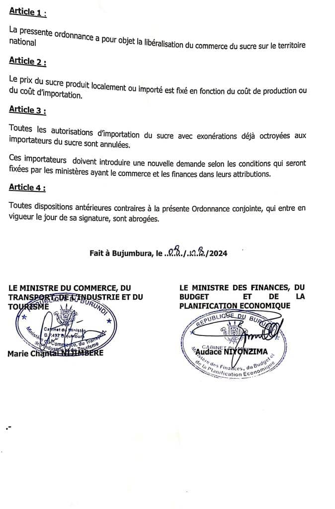 PERMISSION TO ALL SUGAR PRODUCERS IN BURUNDI